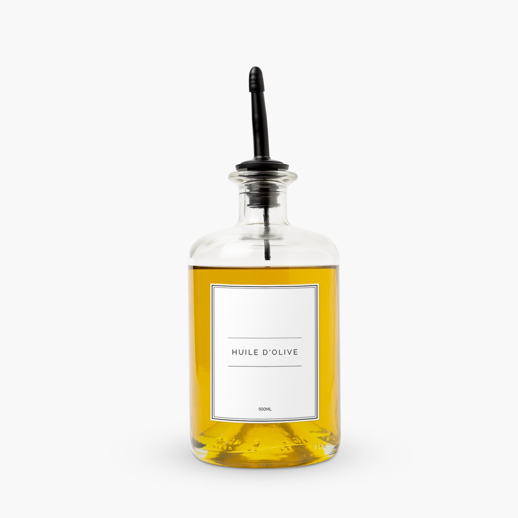 Huilier en verre fabriqué en France. Étiquette personnalisable et 3 coloris de bouchons disponibles.