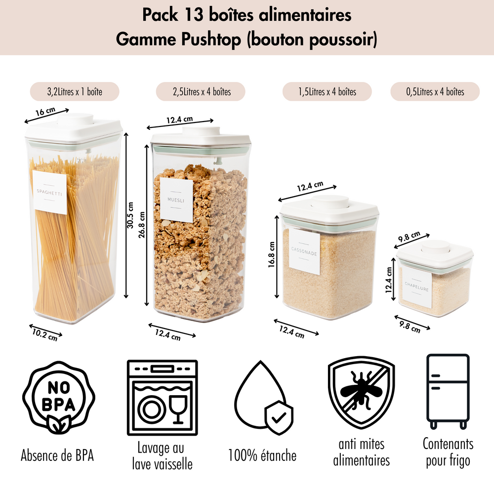 Le bouton poussoir Pushtop permet une utilisation facile et rapide des boites de conservation. Le plastique utilisé est sans BPA et résistant en cas de chute ce qui en fait le contenant idéal si vous avez des enfants !